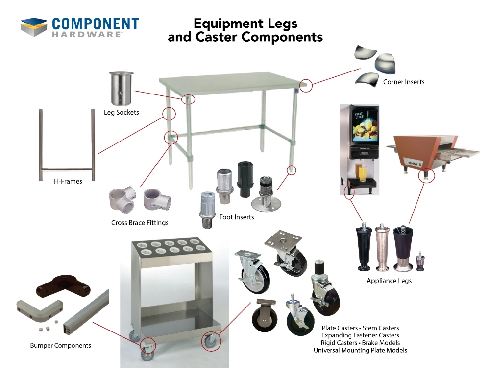 Cabinet Hardware, Cafeteria Components, Casters, Equipment Legs, Lighting and Electrical Components, Fabrication Supplies and Hot Side Components
