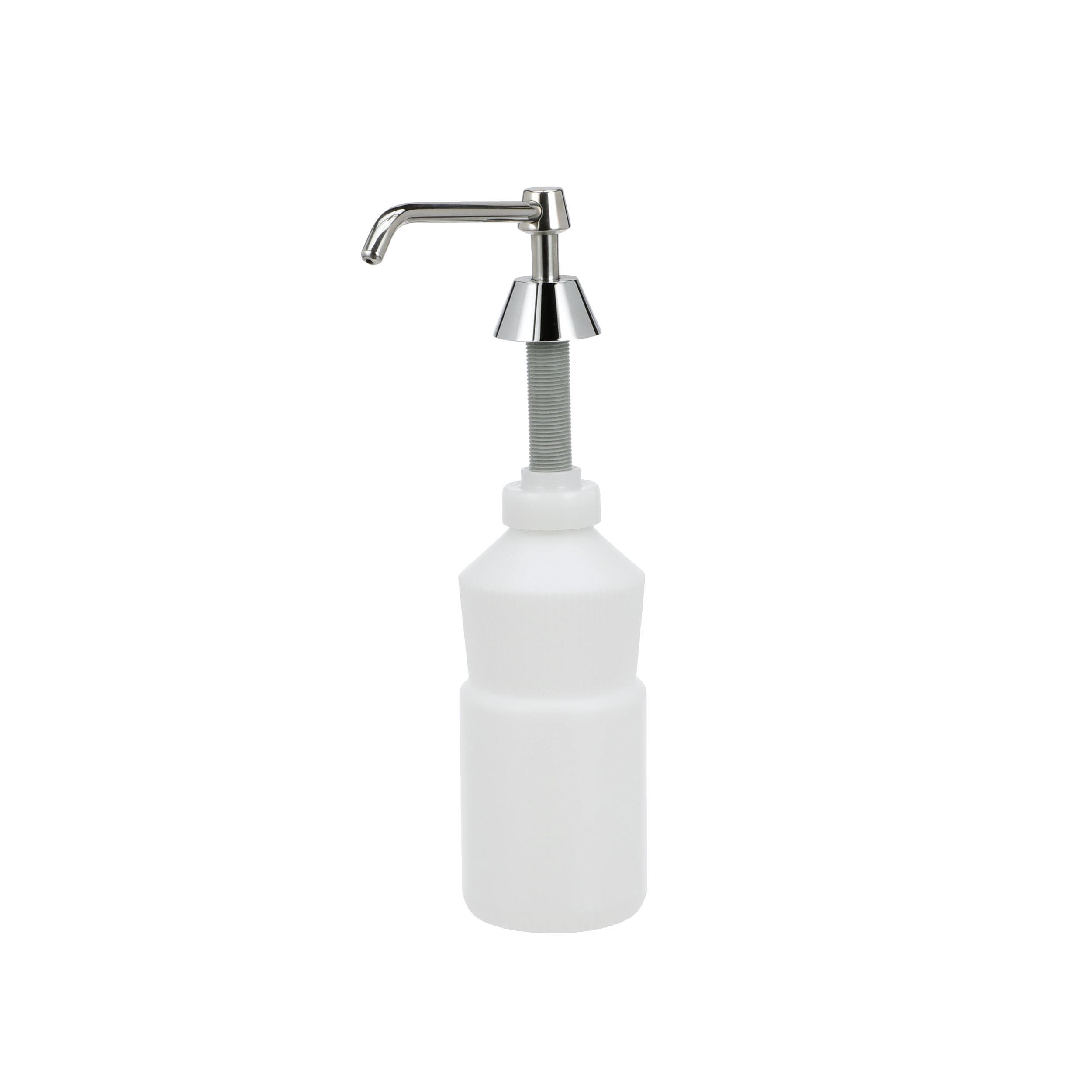 Encore® Soap Dispenser, Manual, 32 oz. Capacity, 3-1/2" x 15" x 7-7/16", White Polyethylene Bottle, Chrome Plated Brass Spout, Pump & Spout, Vandal Resistant, SANIGUARD® Antimicrobial Product Protection